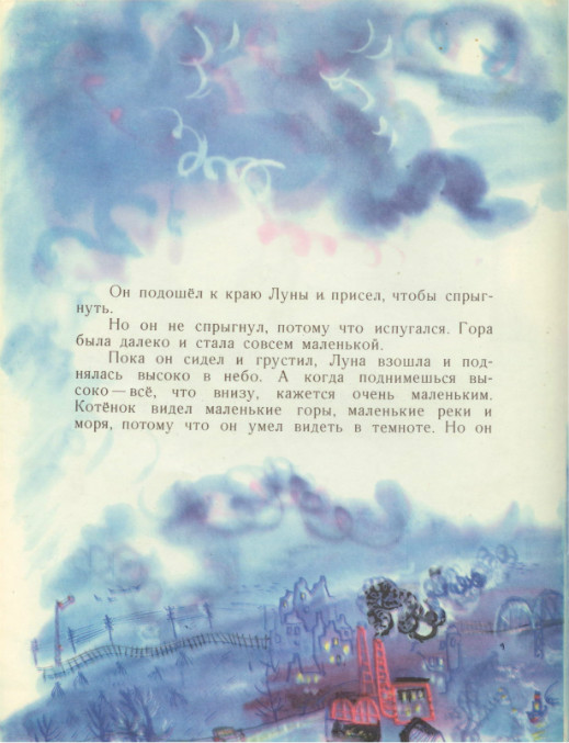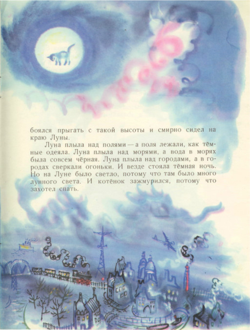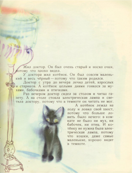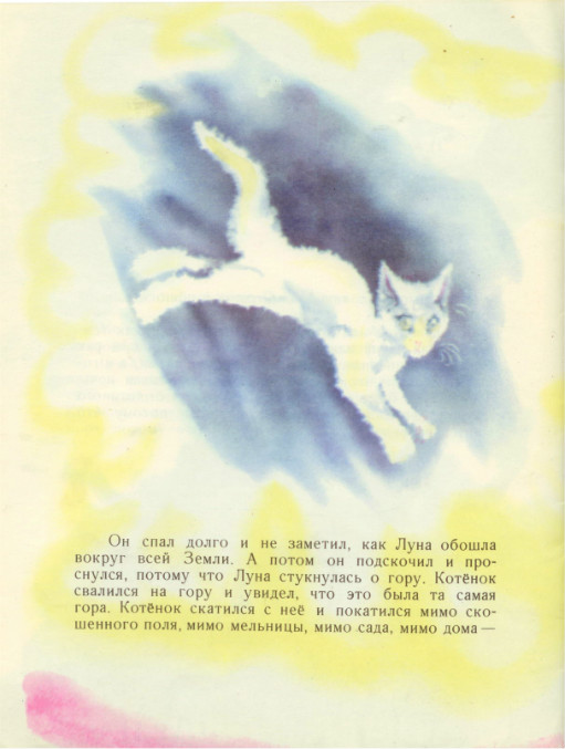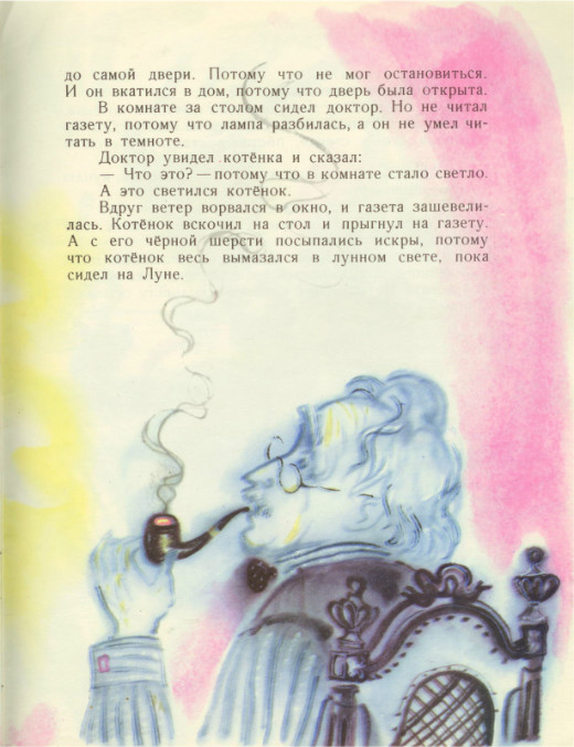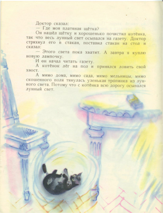 Так однажды маленький котенок, который жил у старого доктора, разбил лампу, и, вдруг, стало темно. Испугавшись, котенок прыгнул в окно и, не разбирая дороги, бежал по улице, пока не взобрался на высокую гору. А в это самое время на горе стояла Луна. И, собственно, что тут удивительного?! Луна каждый раз всходит с этой горы в небо! И хоть на ней висит, объявление, что посторонним вход воспрещен, котенок все равно запрыгнул на Луну, так как ни один котенок, до настоящего времени, еще не научился читать. Малыш так долго сидел на Луне, что когда собрался уходить, она была уже слишком высоко, и он не решился спрыгнуть вниз. От яркого лунного света котенок зажмурил глаза и захотел спать. Проснулся он, когда Луна обойдя Землю стукнувшись, вновь причалила к знакомой горе. Тут уж он не стал раздумывать, и, упав на гору, скатился по ней вниз и покатился по знакомым улицам к дому старого доктора. Когда он появился дома, в комнате сразу стало светло! И искры лунного света посыпались с его черной шерстки. Тогда доктор достал щетку, хорошенько почистил беглеца, пока весь лунный свет не осыпался на газету. Доктор стряхнул лунный свет в стакан, и сказал, что этого света хватит, пока он не заменит разбитую лампу, и стал читать газету.
