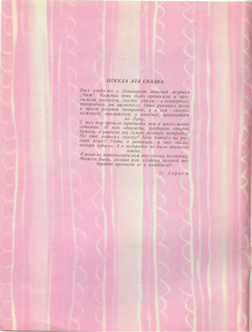 Вот такой простой, но удивительно-волшебный сюжет сказки. Которую неизвестный(ая) перевёл с английского языка и оставил в редакции журнала «Чиж». А много лет спустя Нина Гернет, нашла тетрадь с этой сказкой и пересказала ее по-своему. Иллюстрации нарисованы неподражаемыми братьями А.Г.В. Траугот.