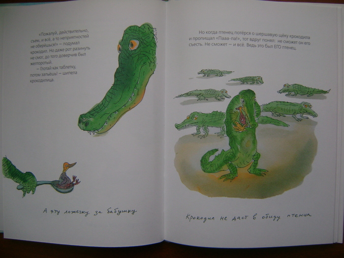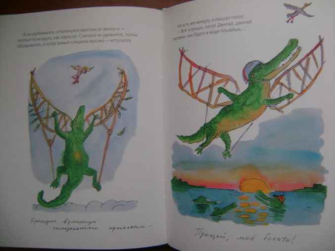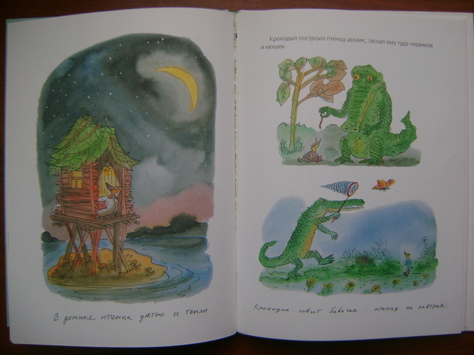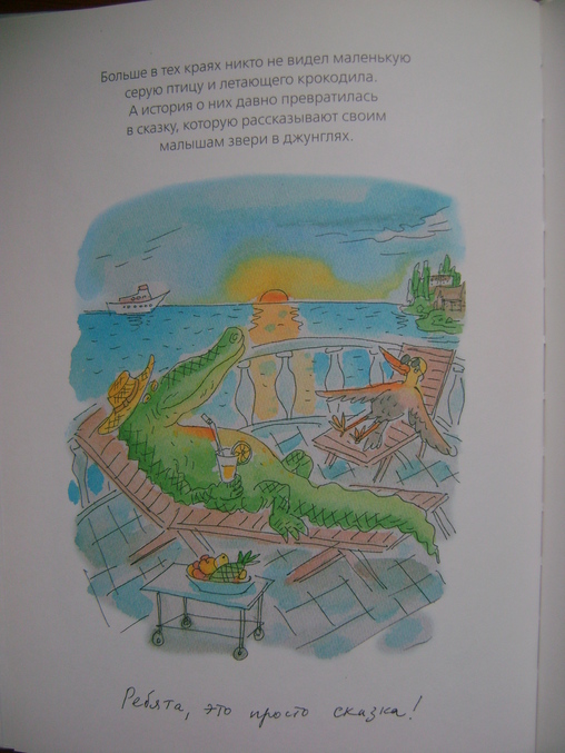 История о том,как крокодильчик заменил папу птенчику,вместо того,что бы его скушать,а птенчик в свою время научил своего" папу" летать)И они улетели далеко-далеко...туда,где больше их не будут обижать и насмеиваться над их необычной семьей)Хорошая,добрая история для деток