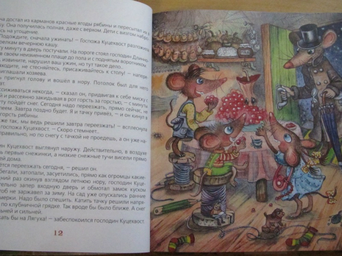 Мне ну очень понравилась книга. Она у нас давно и я все как-то не решалась ее прочитать. А зря, книга отличная. Рассказ о том как в дачном поселке люди уезжают после лета домой, а в это время на зиму в их дом переезжают мыши, которые думают что настоящие владельцы дома - они. Рассказывается подробно как они живут, что едят. И вдруг прилетает летающая тарелка, а на ней с человеческий рост мыши, а люди наоборот ростом с мышей (в общем все наоборот). Как мыши подружились и с гномиками и мышинцами-гигантами!