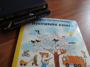 Всем известная Весенняя книга.Сомневалась при покупке,но очень рада,что всё-таки купила.Рассматриваем картинки вместе с сыном.Он многое уже находит по просьбе.Хоть картинки довольно примитивны,но всё узнаваемо.Любимый персонаж тот,что подскользнулся на банане))))везде находим этого мужчину средних лет)))У кого ещё нет такой книги,всем советую!!!