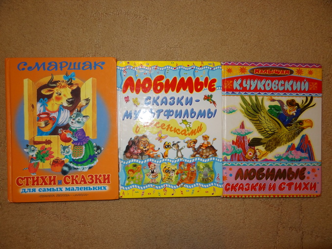 Остальные 2 книги: Сказки -мультфильмы и Чуковский зачитаны (они были самые любимые),но в целом все прилично...у мультов переплет пострадал и внутри странички скотчем заклеивала (старалась аккуратно),у Чуковского тоже внутри заклеивала...)