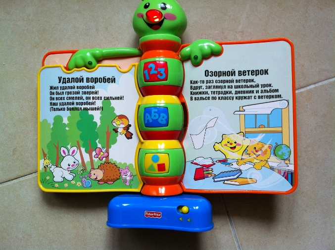 Самой первой книгой в 4 месяца стала интерактивная книга от TiniLove. При включении раздается веселая мелодия, которая, видимо, уже никогда не забудется ни мамой, ни ребенком, так часто вы будете её слышать…Книжку нам подарили на Новый год, и долго меня преследовала мысль, а что бы мы без неё делали? Настолько востребована и интересна ребёнку она оказалась. Пчелка на шнурке мигает огоньками, не ярко, а в меру. Прикоснитесь пчелкой к железной кнопочке на страничке, и услышите звуки животных, мелодии, щебет птичек(по тексту). Отгибаемые элементы шуршат, Цвета яркие и отлично привлекают внимание малыша. Разворота 3, что оказалось вполне достаточно, не утомляет. Вода. Земля. Воздух. В продаже было 3 вида этих книг. Сейчас, кажется, уже ничего нет, но может уже появились новинки или аналоги.