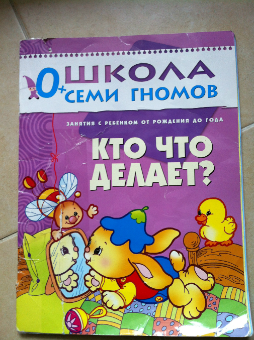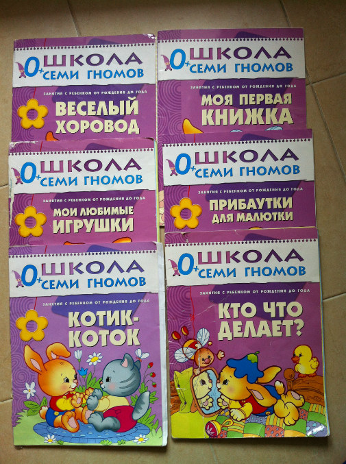 Ближе к году появились и бумажные книги. Правда, я ещё не была знакома с нашим сообществом, иначе это были бы картонки от Розового жирафа. Но ими оказались книги Школы семи гномов. Свою функцию - привыкание к чтению, благодаря крупным ярким картинкам, минимуму текста, неплохим потешкам и стишкам, понятным фразам, - они выполнили на 5, были очень любимы дочкой и она привыкла сидеть и листать книги. Быстро покажу наиболее удачные :