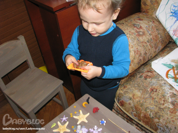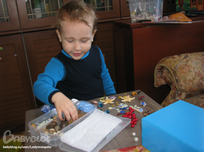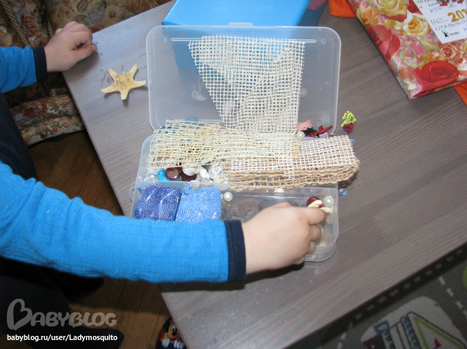 Звезды настоящие морские, бусинки, ракушки и камешки, рыбки, крабы и кораблики, осьминожки и даже штурвал! (Фея как чувствовала, что тематика моря, рыб, кораблей - это восторг)!!!. Цепкие ручки так и выхватывали все из под объектива: