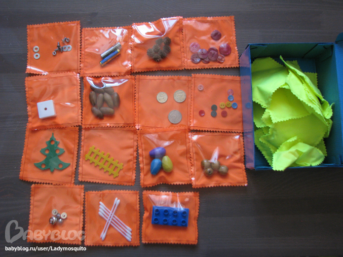 В игре - пакетики, половина с прозрачными вставками и видимым содержимым, половина с таким же содержимым, но не прозрачные, просто тканевые. Ооо, как здорово угадывать то, что прячется в пакетиках!!! Где, где бы я взяла такую шикарную игру, если бы не наша Фея!!!??