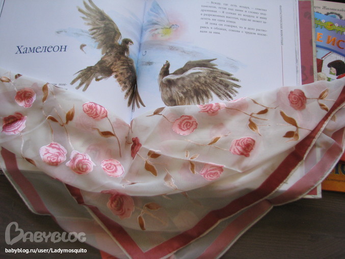Тут я решила достать еще подарочки, но сын не дремлет, через секунду после щелчка фотоаппарата, утащил мой новый восхитительный платок, того самого розового цвета (старой, нежной розы, холодного оттенка), который я обожаю: