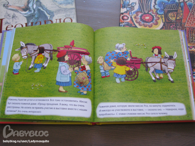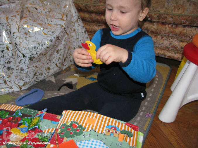 Еле уговорила перевернуть на следующую страницу. А там сад-огород с урожаем, который можно собирать, хозяюшка в снимающейся шляпе, птичка с бантиком завязывающимся, ферма с животными, гуляющими отдельно, яблоня с настоящими яблочками, собачка в будке и на цепочке, выбегающая за нарушителями покоя за пределы страничек, заборчик, который можно построить!!