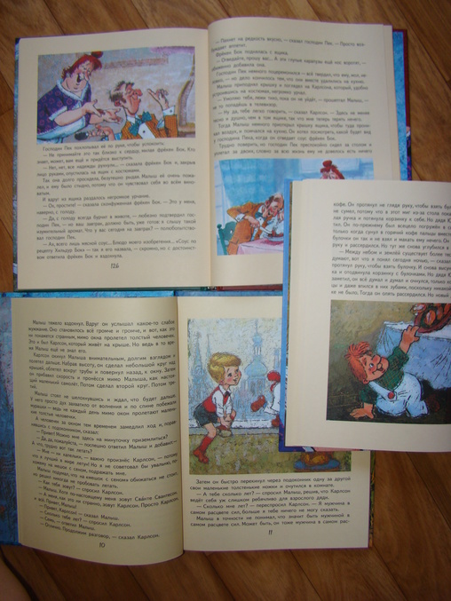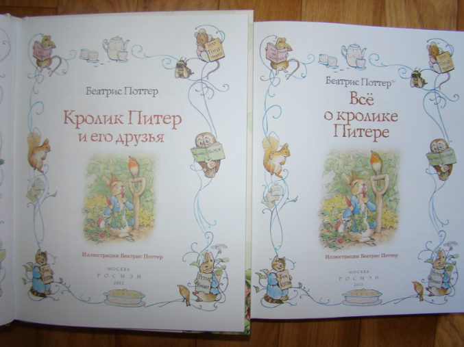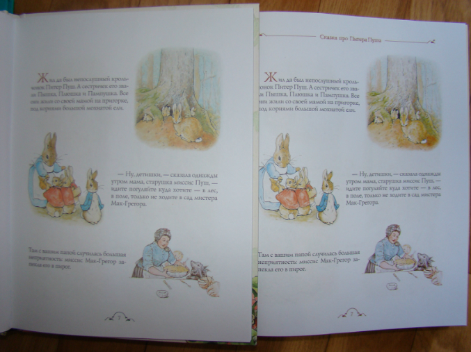 У меня были 3 тоненькие книжки с Биатрис Поттер. Решила сравнить. Тонкие, как вы видите, немного форматом больше. Бумага одинаковой плотности, но в толстой(общей) книжке бумага глаже и белее. Картинки в ней немного ярче и четче, но тоже не везде. Решила оставить нам толстую(общую)