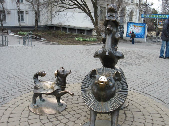 Автор композии Дмитрий Лындин обратился к известнейшему эпизоду «Каштанки» По просьбе дрессировщика животные изображают следующее: на спине свиньи Хавроньи Ивановны располагается гусь Иван Иванович, а на нем — встав на задние лапы, кот Федор Тимофеевич. За всем этим наблюдает легендарная Каштанка.