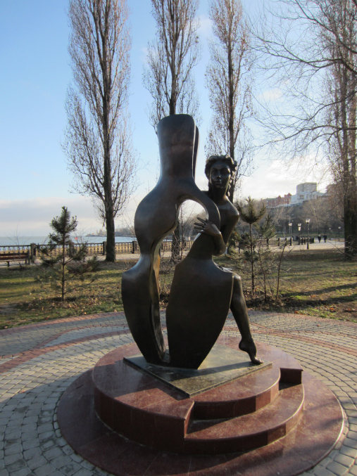 Бронзовый футляр контрабаса, из которого соблазнительно выглядывают изящная ножка и очаровательная головка княжны,- героини веселого рассказа А. Чехова «Роман с контрабасом», установлен на Пушкинской набережной г.Таганрога в 2008 году.
