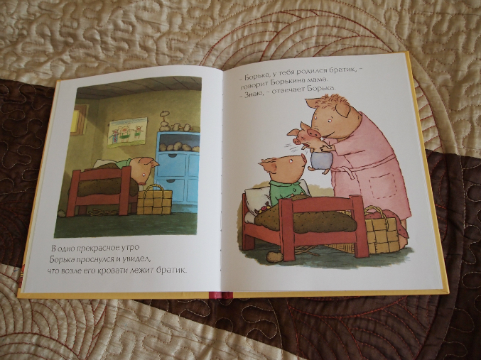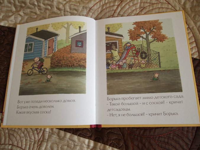 Я не зря выбрала именно эту книгу для первого обзора. Мы сейчас с мужем планируем второго ребенка и хотим морально подготовить нашего полуторогодовалого сына Марка к такому событию (стрессу). При выборе книги на данную тему я хотела, чтобы в игровой и даже бытовой форме было показано появление малыша в семье. Сюжет книги описывает внезапное появление нового члена семьи поросенка Борьки - младшего брата. Этот малыш не просто постоянно капризничает, но и сосет соску, а Борька ведь уже большой и ему соску сосать по возрасту не положено, но так хочется! И вот он идет на хитрость и добывает у брата соску. Именно об этом вроде бы эта небольшая книга нам повествует. На самом деле книга помогает старшему ребенку справиться с чувстом утраченного положения "маленький", когда мама уделает больше времени новому малышу и старший чувствует себя потерянным и обделенным. Одним словом очень нужная и главное полезная для ребенка в такой ситуации книга. Плюс ко всему она ужасно смешная! Кстати Барбру Линдгрен и Улоф Ландстрем - лауреаты премии им.Астрид Линдгрен, в соавторстве они создали серию поучительных книг о поросенке по имени Борька, ставших европейским бестселлером. Вот немного иллюстраций: