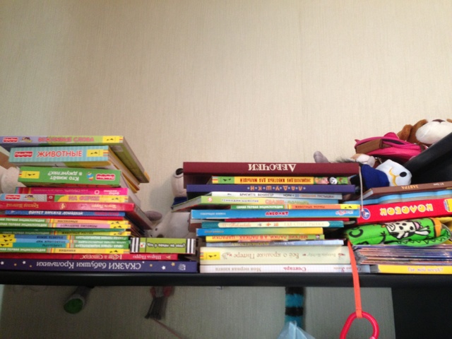 А нам все мало!)))))Я вот на фото заметила отсутствие еще нескольких книг,видимо Ева их читала в то время:)У нас игрушек сейчас почти нет,мы в них почти не играем,Ева каждые минут 20 показывает на полку с книгами,несу ее туда,она выбирает книгу и вперед-читать.За день можем книг 10,а то и 15 прочитать:))))