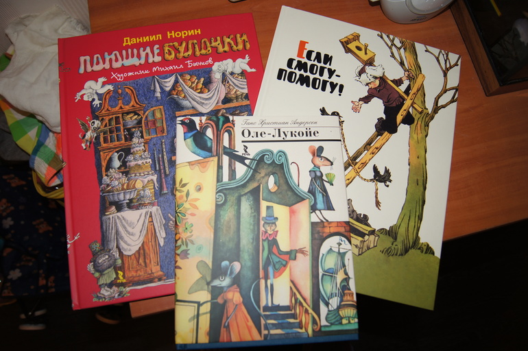 Книги всем хорошо известны, но у нас их не было, а тут такая щедрость любимого издательства, что я с удовольствием восполнила пробел. Причем на удивление угадала: Если смогу-помогу сразу же полюбилась сыну, читали и смотрели весь вечер; Поющие булочки крайне заинтересовали меня и уложив сына спать я с радостью принялась за нее; А наш папа вцепился в Оле-Лукойе и даже сыну не дал))))