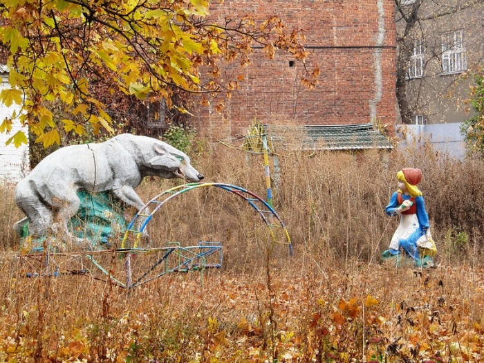 только Красная Шапочка. Но так как фольклорный сюжет о маленькой девочке, повстречавшей волка, был переработан не только Шарлем Перро, но и братьями Гримм, не всегда ясно, чьей именно героине памятник