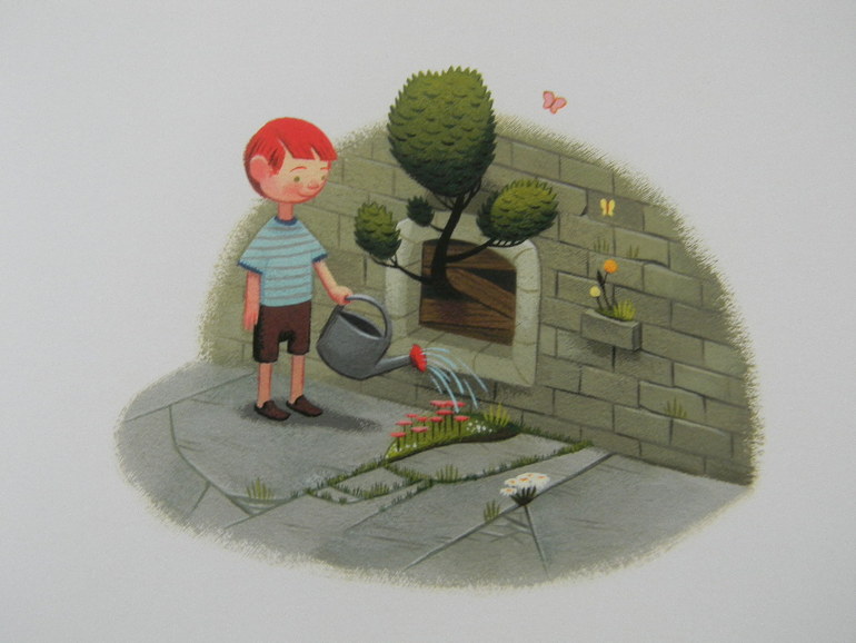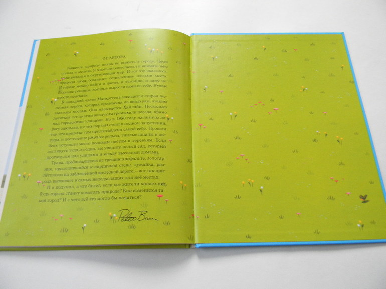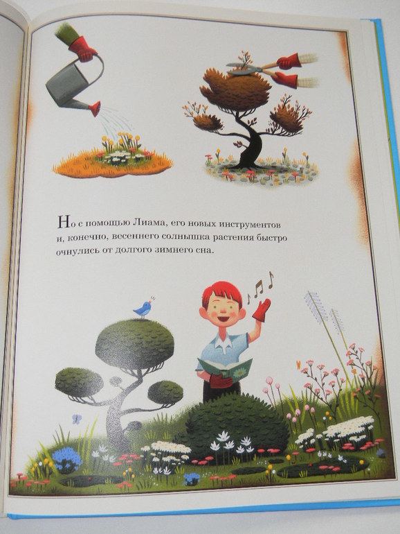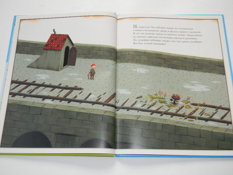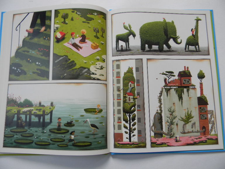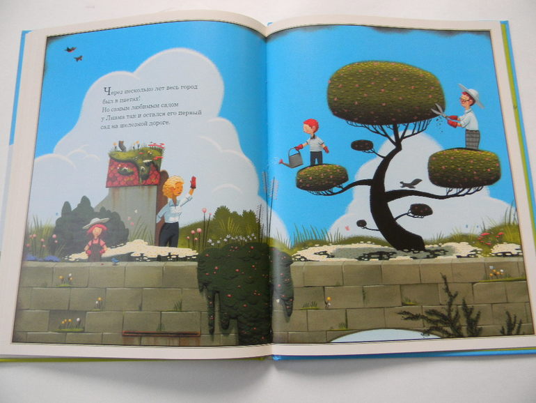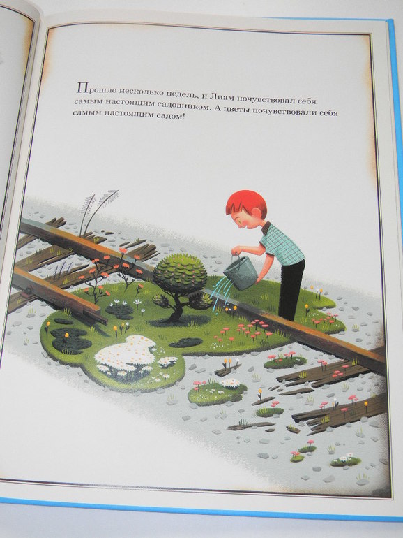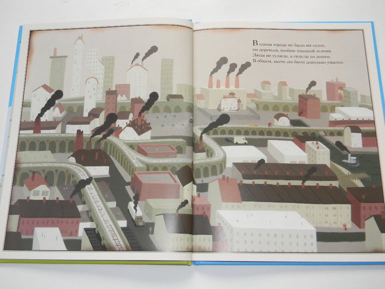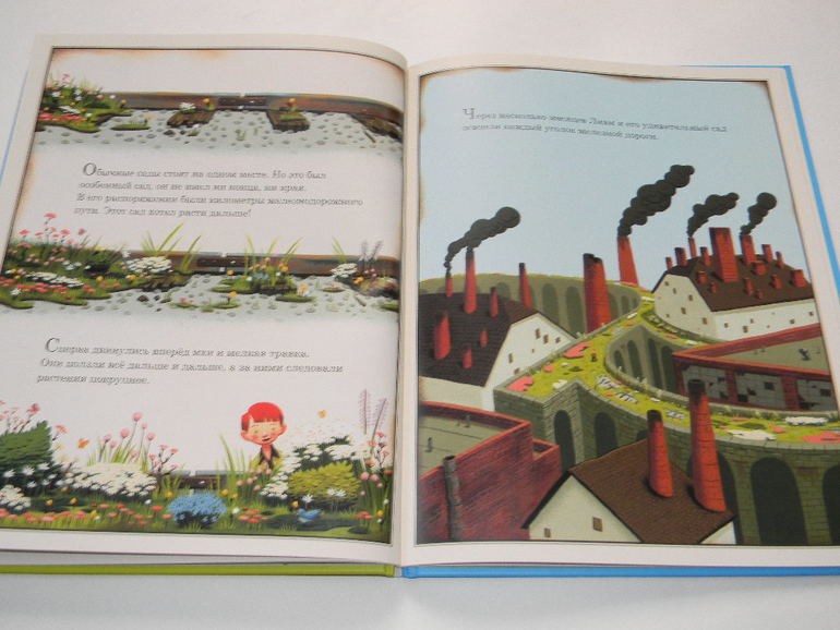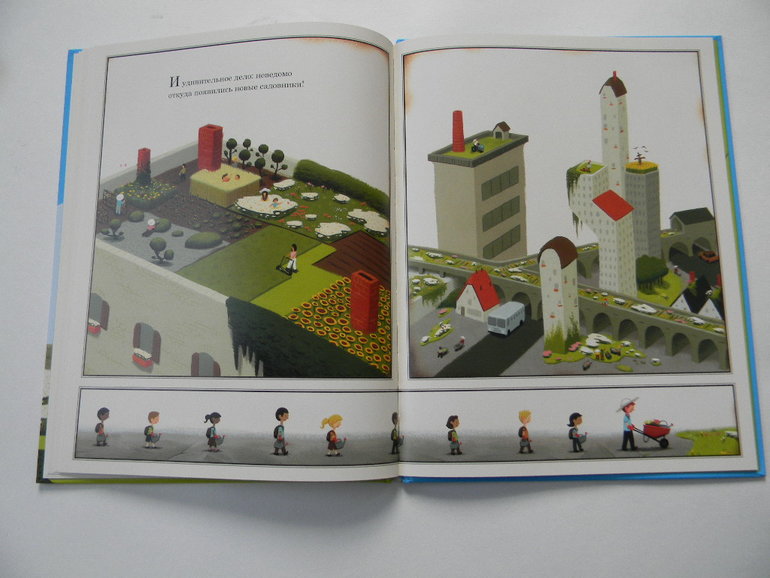В начале мы видим серый, унылый и безжизненный город, который постепенно превращается в сочный зеленый сад, превращения происходят постепенно и очень увлекательно наблюдать за этим процессом, разглядывать каждую картинку и можно многое обсудить с ребенком . Мы книгу читали и разглядывали как минимум 30 -40 минут, а в книге всего то 32 страницы. Но сын так впечатлился !!!! Я даже не ожидала что ему так понравится.