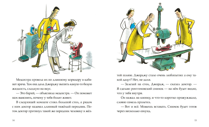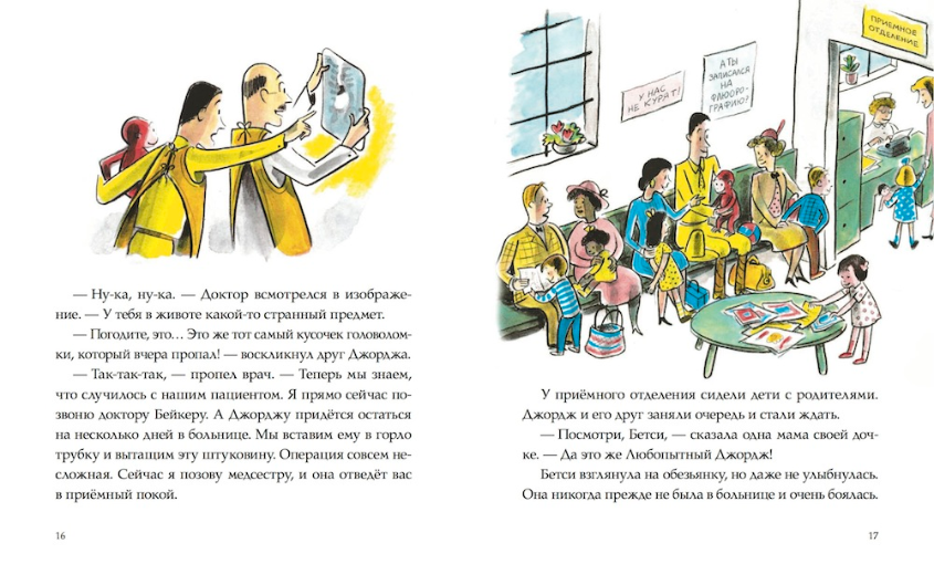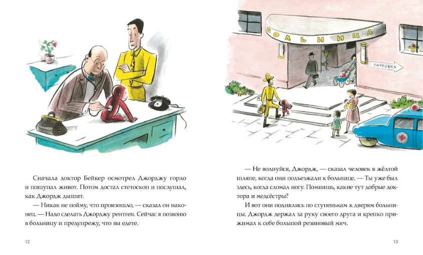 Никто не любит болеть: и чувствуешь себя плохо, и приходится пить горькие микстуры, глотать таблетки и терпеть уколы. Мы, взрослые, хотя бы понимаем, что неприятное лечение — путь к выздоровлению, а вот детям это объяснить нелегко. Фанаты книг, созданных Х.-А. Реем и его женой Маргарет, утверждают, что нет лучшего средства от страхов перед болезнью. Ведь оно помогает детям преодолеть неприязнь к людям в белых халатах и спокойнее пережить ситуацию, когда в больнице оказывается кто-то из близких. И средство это — книжка «Любопытный Джордж попадает в больницу». Джордж угодил в переделку как всегда —- из-за своего любопытства. Сначала он открыл коробку с паззлом, которую приготовил для него человек в большой желтой шляпе, а потом засунул в рот маленький яркий кусочек головоломки. И, конечно, проглотил. И, конечно, у него заболел живот. Старший друг отвез Джорджа в больницу, где его оставили, чтобы сделать операцию. И Джорджу, конечно, стало очень грустно. Книга написана с добрым юмором и вниманием к чувствам героев. Причем Реи рассказывают не только Джордже, но и о других детях. Все оказались в больнице по разным причинам, кто-то вынужден лежать в постели, кто-то — передвигаться в инвалидном кресле. Но врачи и медсестры заботятся о каждом и делают все, чтобы маленькие пациенты выздоровели и поскорее отправились домой. Выздоровел и Джордж и опять не усидел на месте. Ведь вокруг так много интересного!!! Если вы читали другие книги про эту обезьянку, то знаете: рано или поздно Джордж устроит такое… А еще вы наверняка знаете, что у каждой книжки про Любопытного Джорджа счастливый (а порой и поучительный) финал. Так и в этой, шестой по счету истории из прекрасного сериала, придуманного и нарисованного супругами Рей.