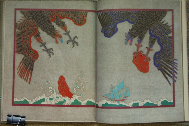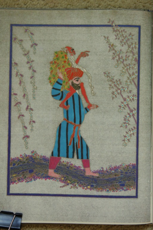 Дальше глава начинается вот таким разворотом с Синдбадом с глобусом. От главы к главе Синдбад меняет цвет наряда.