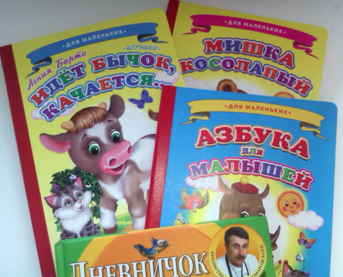 И вот прибыли наши первые приобретения: сказки Пушкина, Чуковского, стихи Барто, и конечно же картонные книжки для самых маленьких, которые интересно не только читать но и жевать, особенно прорезающимися зубами, до которых нам видимо уже недалеко!))