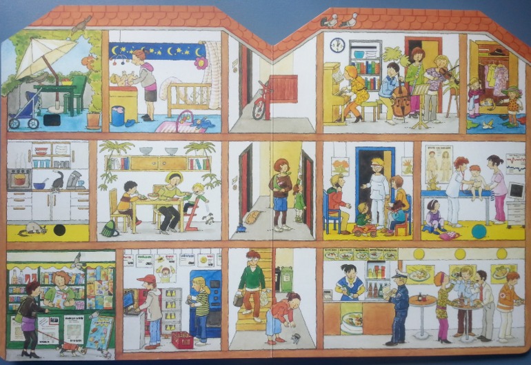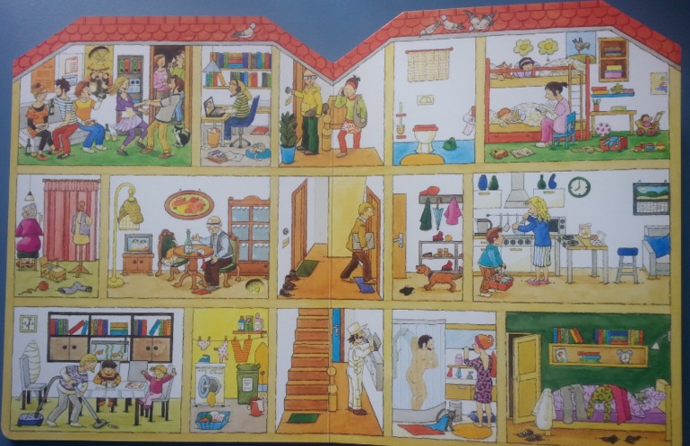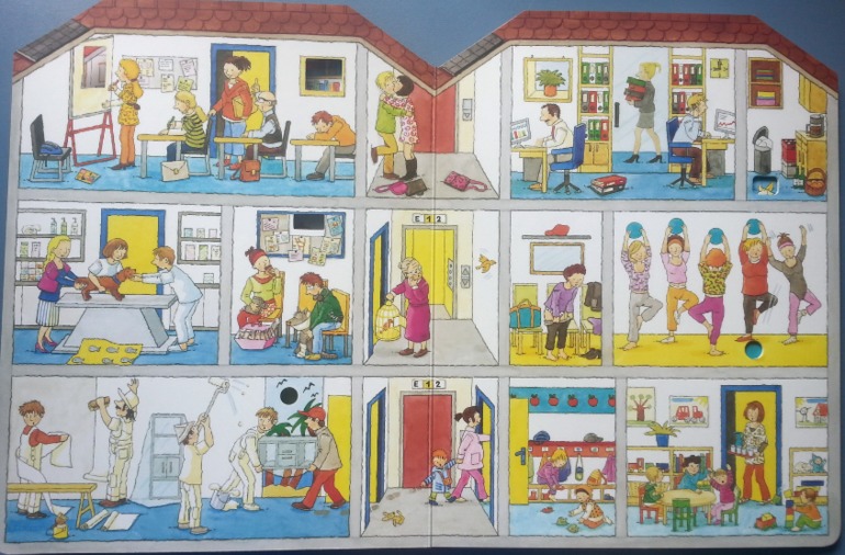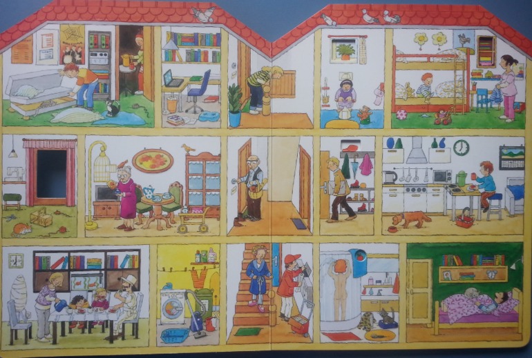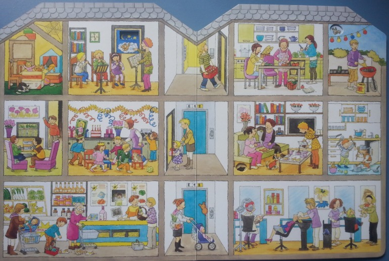 Показана жизнь многоквартирного дома с несколькими подъездами. Кто-то завтракает, кто-то спит , кто-то делает ремонт...... Очень много жизненных ситуаций. Но есть некоторые моменты (например - плакат мужчины и женщины в кабинете врача), которые не принято показывать в детских книгах , но с другой стороны это жизнь, наши дети очень быстро взрослеют, и пусть лучше смотрят и обсуждают это с мамой, чем в детском саду или во дворе украдкой, да и нарисовано все прилично, без пошлостей.