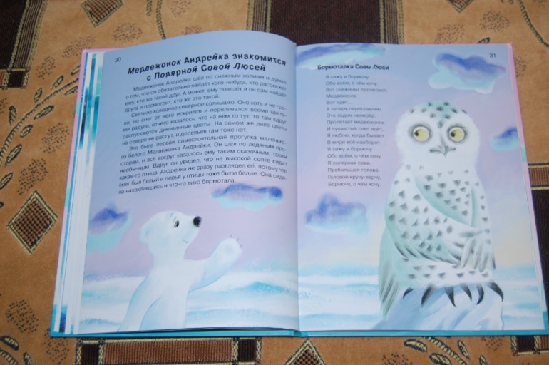 Читаем за один раз не более 2 сказок, все таки стихи больше любит. Сама книга отличная, мягенькая, странички гладенькие, приятная, дочь любит ее обнимать.