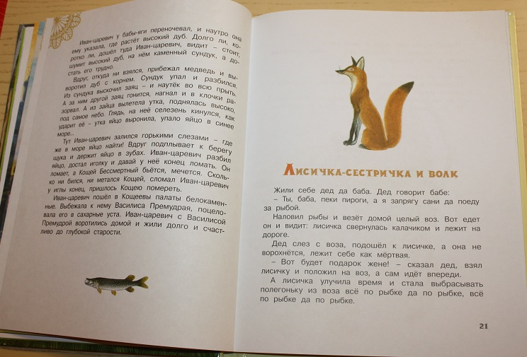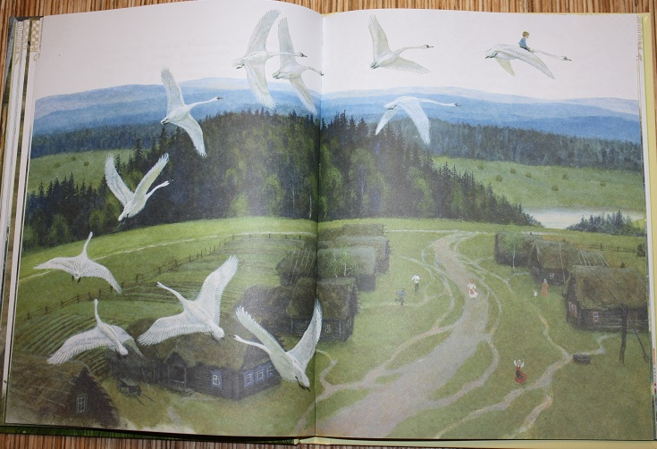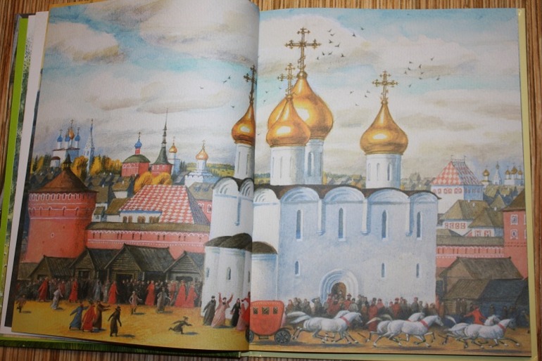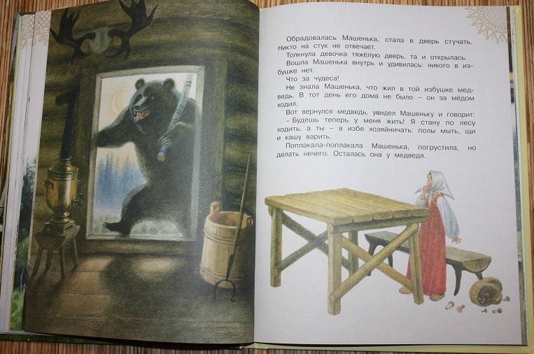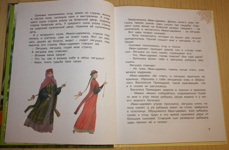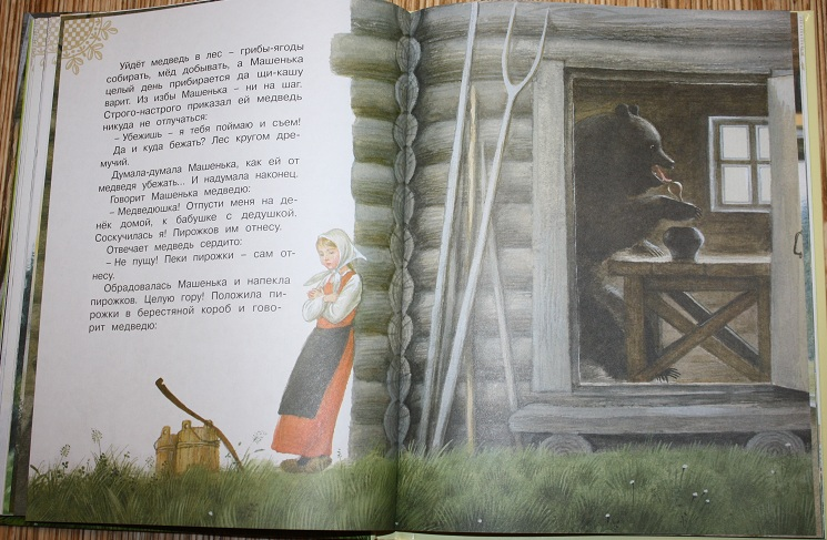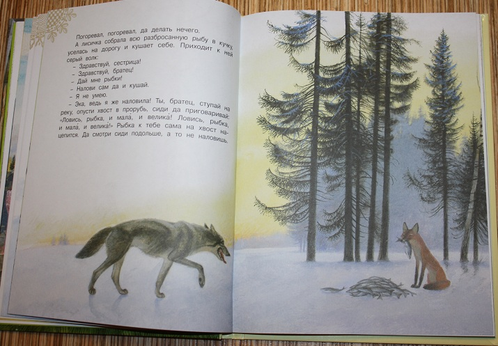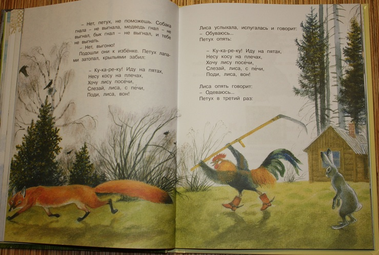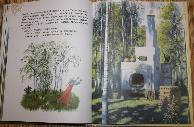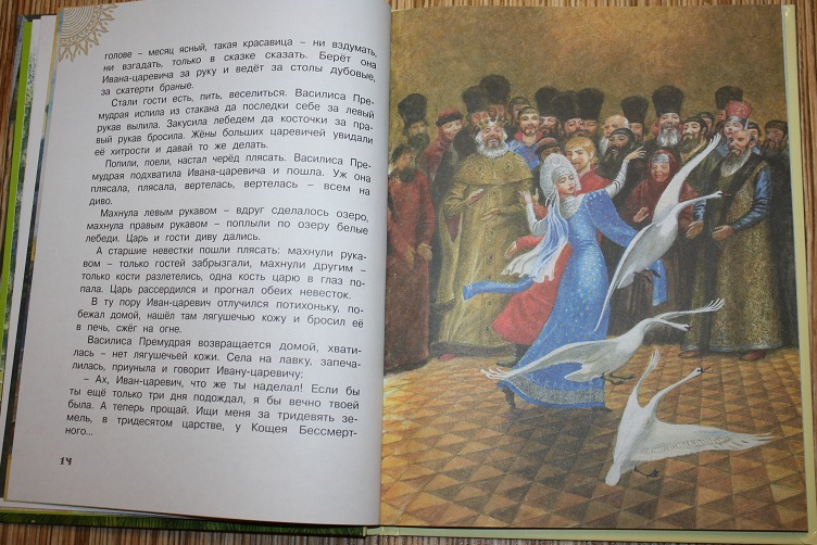 Настолько впечатлилась книгой, что несколько раз подряд перелистывала странички, рассматривая иллюстрации. Художник так талантливо нарисовал сказки: что не только у людей, но даже и у животных очень легко читаются эмоции и настроение, например, лисичка-сестричка изображена не только с озорными глазками, но еще и с такой хитрющей ухмылочкой. Иллюстрации, действительно, выглядят очень сказочными и в тоже время живыми: избушка, шагающая на куриных ножках и разговаривающий с ней Иван-царевич; танцующая Василиса с лебедями и аплодирующие ей гости на пиру; прогоняющий лису петушок; колоритный медведь, на минутку присевший отдохнуть на пенёчке. И все это на лоне богатой красками русской природы, лепота :))