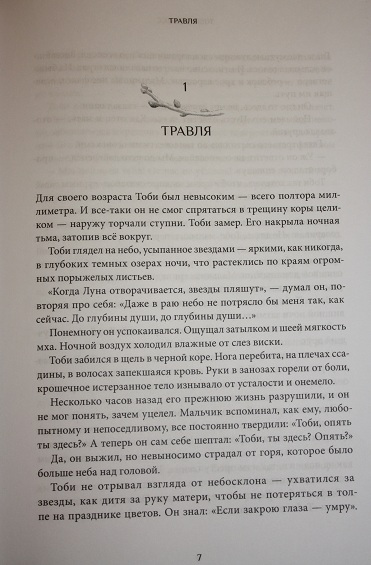 И самое начало истории про не просто маленького, а очень маленького, всего 1,5 мм, мальчика. В то же время Тоби- очень умный, смелый и отзывчивый, много бед и лишений пришлось узнать ему на родном Дереве. Совсем отчаявшись, мальчик, оставшийся без родителей и друзей, решился на отчаянный шаг- "проститься с миром". А, к счастью, попал к Травяному племени, или, как называли их на Дереве, "Облезлым". И здесь Тоби нашел друга, научился охотиться и радоваться свободной жизни. И вдруг, снова все переворачивается с ног на голову: с Дерева спустился незнакомец, рассказавший о том, что его родители живы, а Элизу, его лучшую подругу насильно выдают замуж за его бывшего друга...