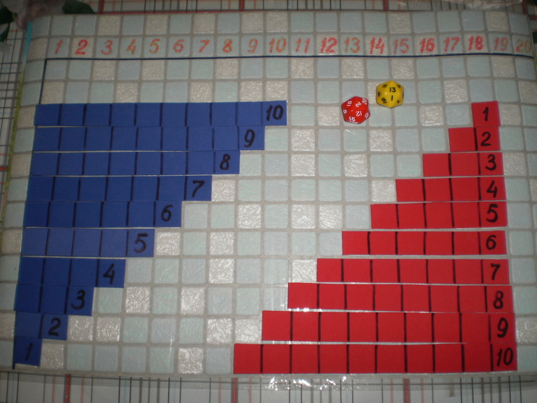 Еще вот такая таблица хороша - это типа "вольное переложение" таблицы сложения Монтессори. Кидаем с малышней кубики с точками, со старшими - эти икосаэдры и складываем-вычитаем выпавшие числа при помощи планочек. Очень наглядно.
