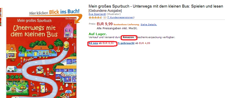 Я обвела красным слово Amazon - это именно амазон-продавец, естественно, по умолчанию он себя предлагает в первую очередь. А ниже предлагает еще 64 предложения этой книги от других продавцов по цене от 8,50 евро, но там как правило нет доставки в наши СНГ.Ой, поделюсь с вами со своей только что находкой! Вот та книжка, которая у меня была 6-я от другого продавца, она была б/у (новой не было) по цене 5,53 евро. Я нашла сайт с бесплатной доставкой книг по всему миру! http://www.betterworldbooks.com Там цена новых книг, я посмотрела, процентов на 50% выше чем на амазоне, но эта б/у там стоила 6,48 дол.!!! Написано, что в очень хорошем состоянии, ну 6-ю долларами можно и рискнуть, хотя пишут если что - 100% возврат денег :)) Но даже если книжка стоит 5-10 дол., а у них на 50% она дороже, а доставка бесплатная, а книжку очень хочется, то почему бы и нет... :)) в общем оплатила только что, написано 10-21 день доставка. жду!