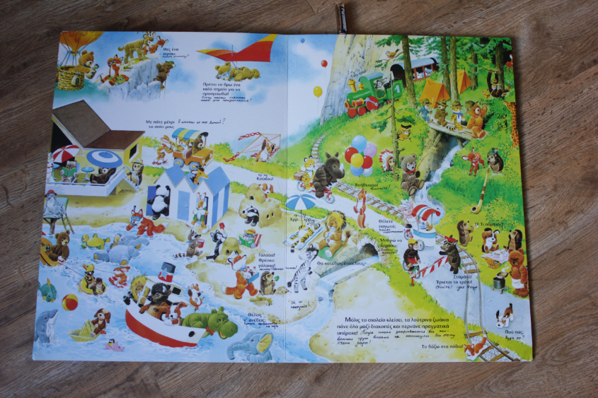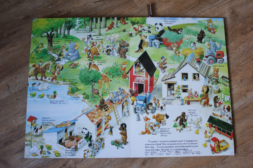 из всех выложенных в ББ книг я остановилась только на 3. две из них (верхняя левая и нижняя правая) всем известны, поэтому выкладывать не буду. с третьей же я решила рискнуть и взять её дорожный вариант. и она оказалась единственной из всех книг, которая меня немного разочаровала.это комплект из 4.книги очень маленького формата: 13 на 13 см, по 4 разворота каждая.каждый разворот - это кусочек большой иллюстрации крупноформатной книги.порадовало разделение на темы и присутствие иллюстраций, раннее которые я не видела. сами книги идеальны как походный вариант (авто, поликлиника и т.п.). смотрите сами (сфотографировала только развороты по следующему порядку - синяя, жёлтая, красная, зелёная книги):