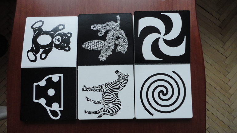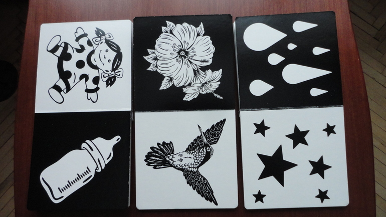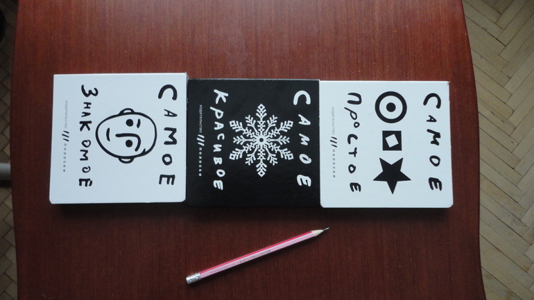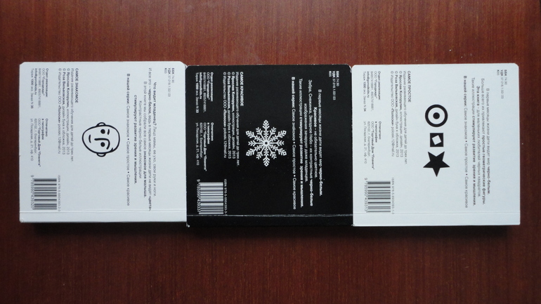 Это одна из трёх книжек, выпущенных издательством "Полоски" в 2013 году и предназначенных для разглядывания младенцами, которые, как доказали учёные, не имеют цветного зрения (подробнее- вот тут:http://mamuli.info/blog/malishi/428.html).Я постояла-постояла, пооблизывалась-пооблизывалась и купила в результате все три:"Самое красивое", "Самое знакомое" и "Самое простое". Несмотря на то, что две внучки, хоть и маленькие, но уже далеко не грудные, я твёрдо верю, что демографический взрыв моей семье ещё только предстоит.Никаких следов вышеупомянутого издательства в Интернете не обнаружила. Тираж каждой книжки 1000 экземпляров.