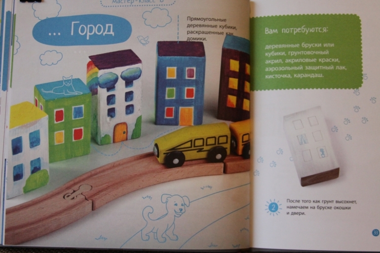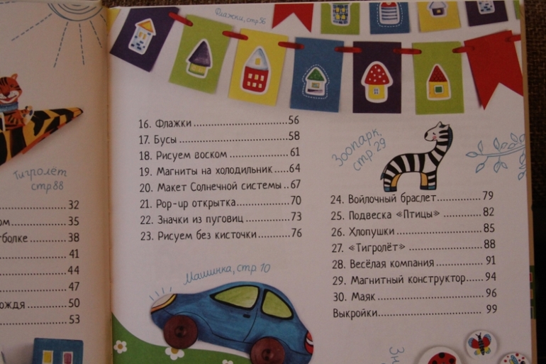 В книге 30 идей с небольшими мастер-классами и выкройками/шаблонами (если они необходимы). Хоть сейчас и много ресурсов, где можно найти и МК, и идеи, мне такая книга полезна. Во-первых - она чаще попадается на глаза (и мне, и детям), а значит вероятность того, что мы что-нибудь сделаем, гораздо выше, чем у того бесконечного количества страничек и закладок из интернета, которые "увидел/понравилось/когда-нибудь сделаю/забыл". Во-вторых - ребенок может сам что-нибудь захотеть сделать - и не обязательно строго по инструкции: фантазия же развивается непрогнозируемо!