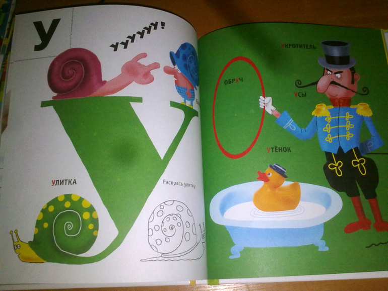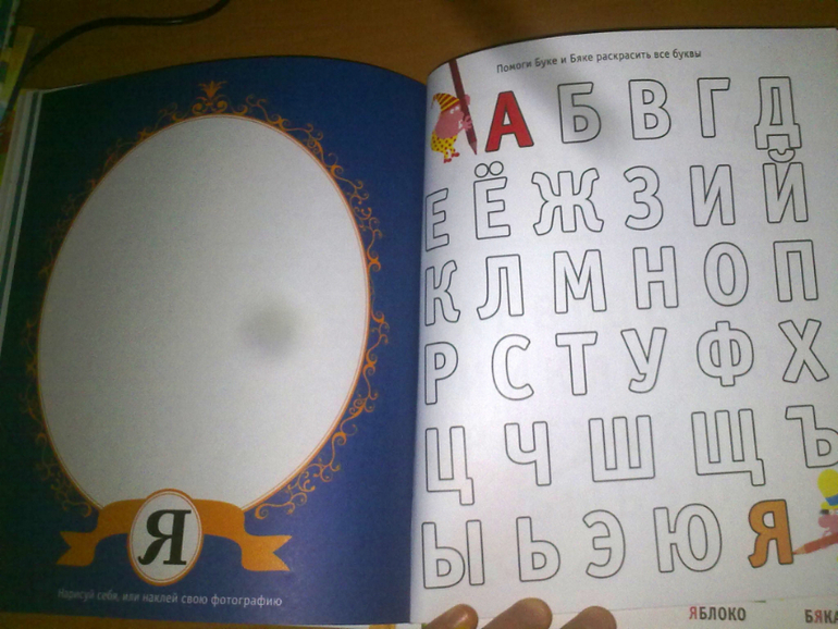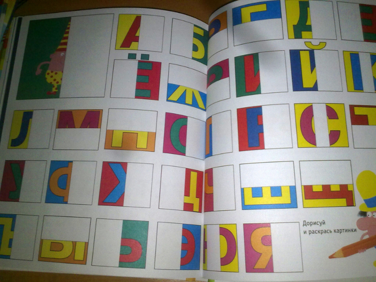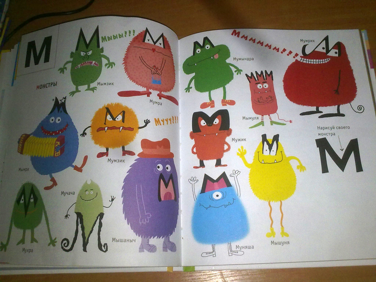 Задания не только к буквам, но и к алфавиту целиком - в конце. Книга поощряет творить и выдумывать. Мы вовсю рисуем монстриков (ребенок впечатлен ими), придумываем о них истории. Монстрик Мымуля, у которого хвост-шнур, был сегодня мною аккуратно срисован и "включен" в нарисованную розетку, а ребенок его зажигал с помощью желтой гуаши. Такой нацеленности на результат при рисовании сын еще не показывал.