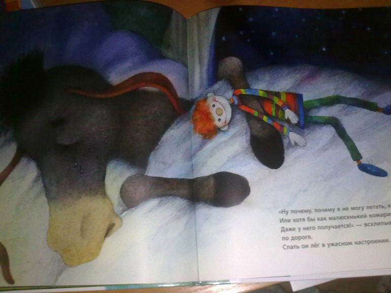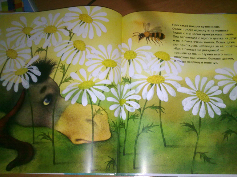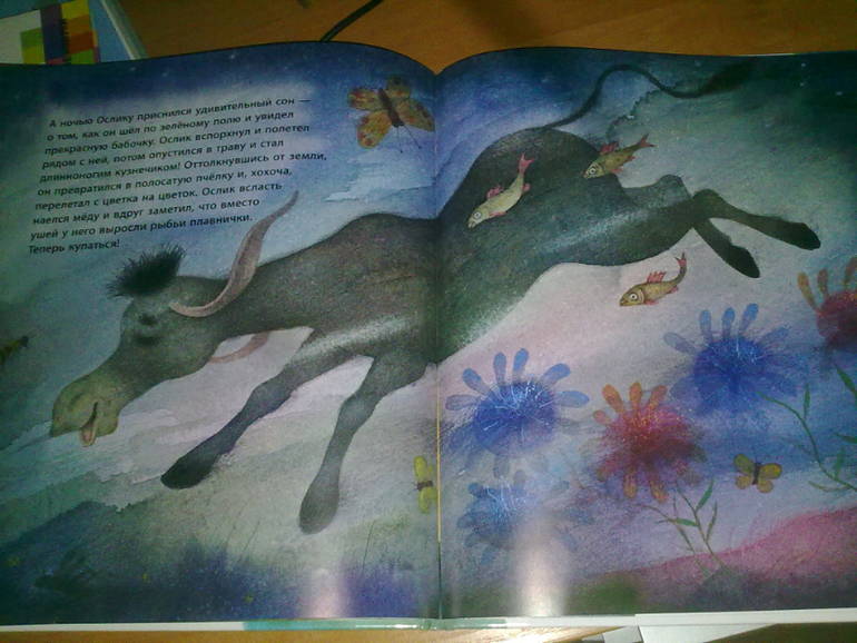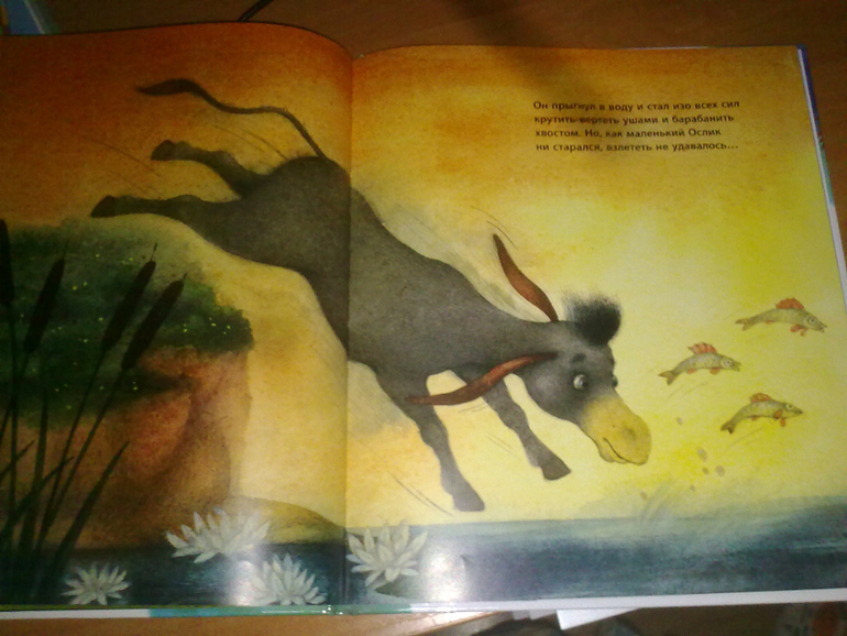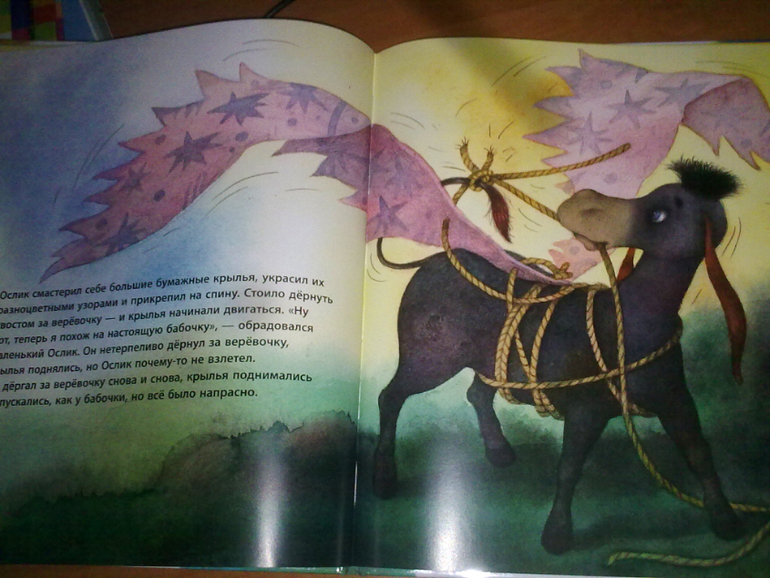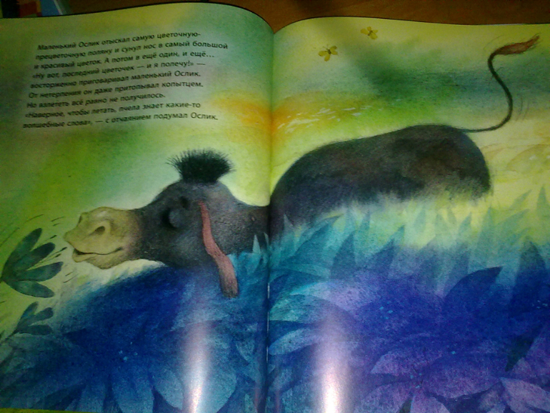 "Летающий ослик". Очень акварельная книжка от "Акварели" и Антоненкова. От иллюстраций не оторваться. история проста - ослик очень хотел научиться летать и присматривался ко всем, кто хоть чуть-чуть умеет это делать. Перенимал опыт, так сказать)). Но, оказывается, некоторые мечты могут осуществляться не наяву, а только во сне.