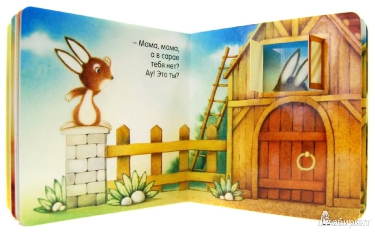 Чтобы было понятно, основная тема книги: зайчонок ищет свою маму. На страничках открывающиеся окошки, за ними мы видим носик, лапки, хвостик, ушки, напоминающие заячьи, но перевернув страницу обнаруживаем там совсем другое животное.