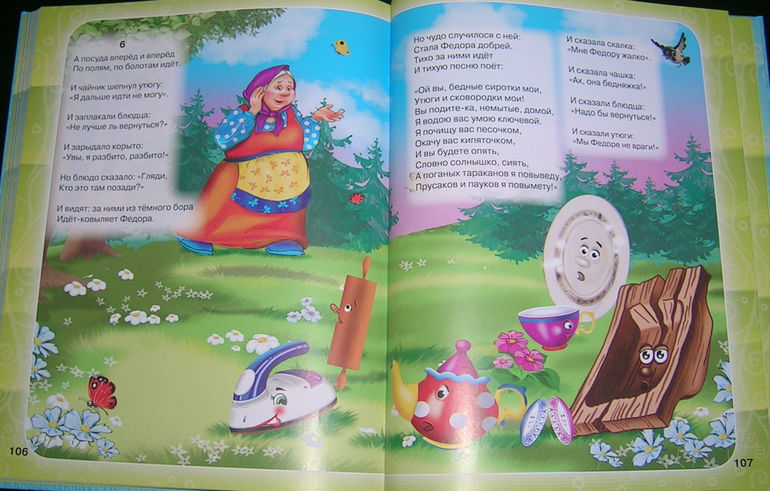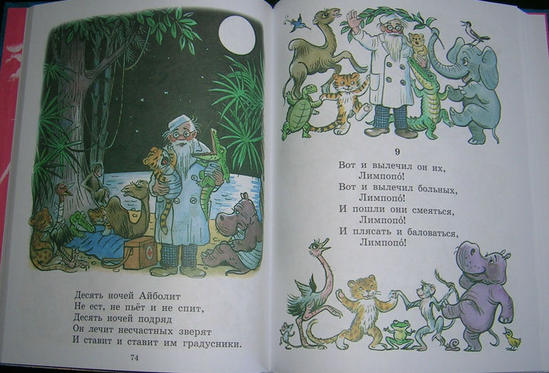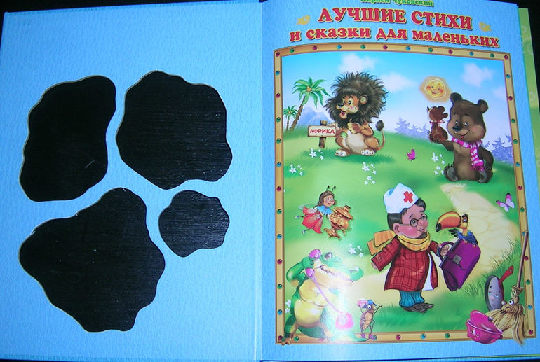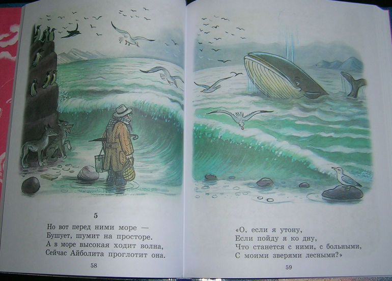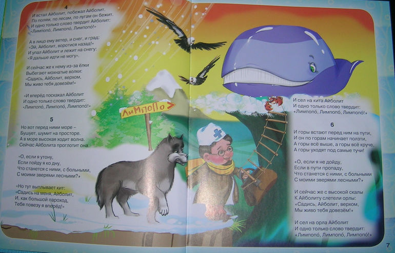 Первая появилась у нас на книжной полке из серии "Лучшие стихи и сказки" (My-shop, Read, Озон). Из-во Проф Пресс. Сделано как подарочное издание. Обложка с окошками, мелованная бумага, яркие иллюстрации. Очень мне понравилась при покупке. Но... в процессе находишь к чему придраться. Не все картинки мне нравятся, но есть очень мне симпатичные. Доктор Айболит правда вообще не вызывает положительных эмоций. Явно компьютерные картинки, не всегда соответствующие настроению и иногда смахивают на "наляпывание". Например, радостный Айболит при встрече с Китом (при том, что он изнемогает от усталости и переживаний за зверюх) или чистая Федора, еще до ее преображения. В итоге, я до конца никак не определюсь по поводу чувств относительно этой книги.