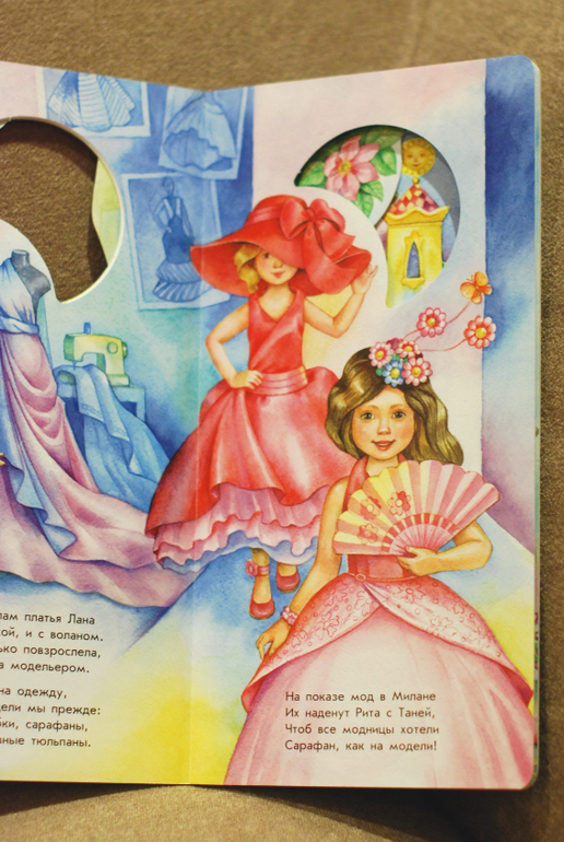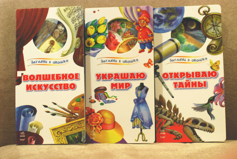 Серия "Загляни в окошко" изд-ва Ранок. Картонки) Окошек в виду клапанов, как все привыкли, там нет. Есть круглое окошко на обложке, через которое вдно фрагменты всех страничек. По 4 разворота в каждой книжке, формат нестандартный - высокие и узкие. Внутри - стихи о разных профессиях и иллюстрации. Мне нравятся))