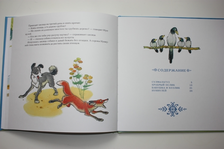 А в сказке "Нуннулей" не говорится сколько всего было птенчиков у сороки? На рисунке в начале сказки их четверо, по сюжету двоих Нуннулей отдаёт на съедение лисице, а сразу после сказки страничка с содержанием и над ней изображена счастливая Нуннулей со своими птенчиками, и их снова четверо. Сын посчитал это неправильным и просил перечитать сказку ещё раз, вдруг он пропустил упоминания количества маленьких сорочат.