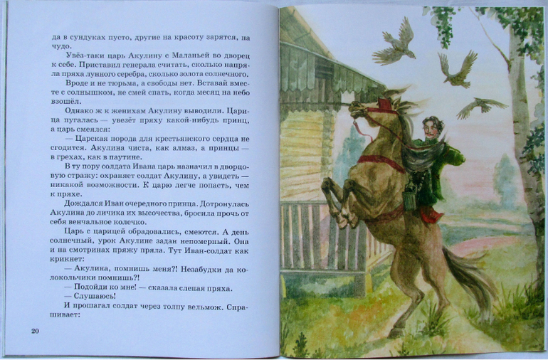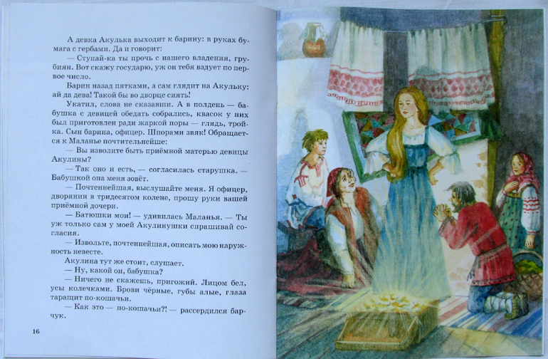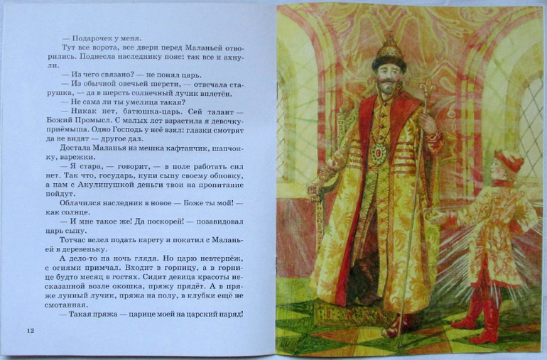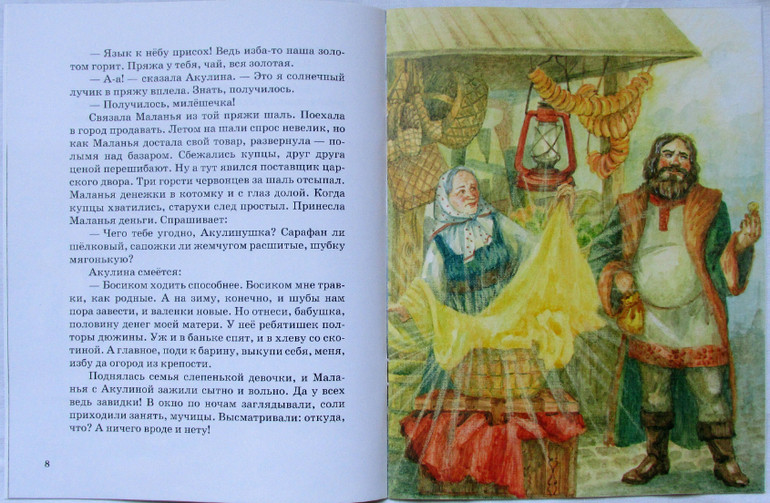 Открылся у Акулины необычный талант, стала она прясть золотую да серебряную пряжу, то лучик солнечный в нее вплетет, то лунный. И барины и цари стали золотом засыпать юную рукодельницу за ее прекрасную пряжу, жизнь у старухи с девицей налаживаться стала.