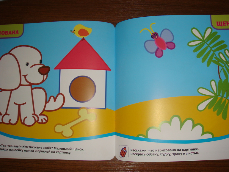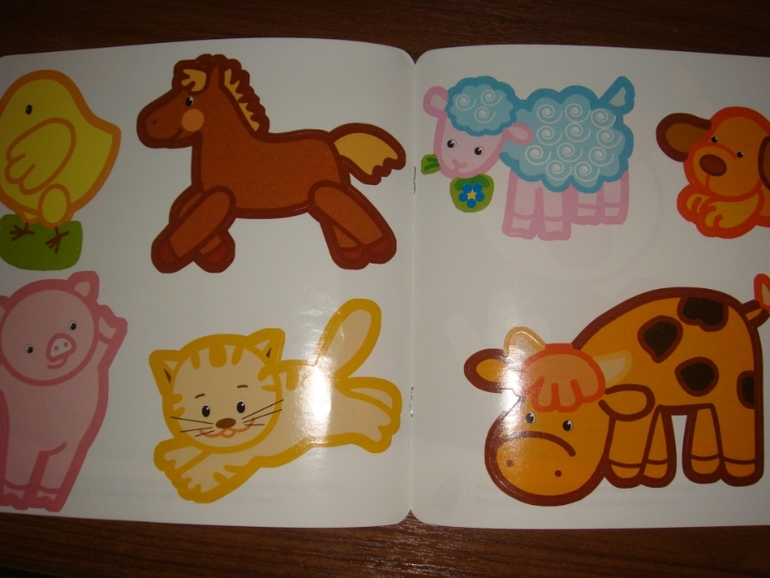 А вот от этой книги я и не ожидала столько пользы. Когда она к нам пришла, я тут же заказала остальные из этой серии. Смотрите сами. Тут и раскраска для самых маленьких, и красивые картинки, и развитие звукоподражания и задания для малышей, ну и конечно же наклейки. Нужно подобрать детеныша для каждого животного.