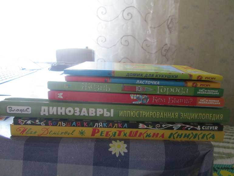 Это заказ с казахстанского сайта озон. Ждали мы эти книги (заказали с подругой вместе) около месяца. Получили сегодня. Из этой стопки пока немного почитали энциклопедию про динозавров,которую я долго ловила на озоне. Нас ожидает занятие или несколько-по динозаврам,в ближайшее время будем подробно изучать.