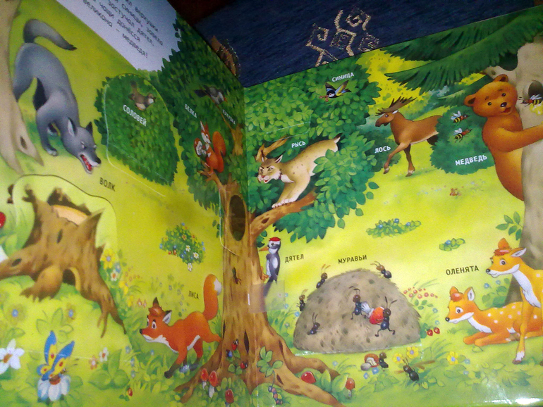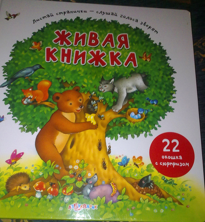 Яркая звуковая книга с окошками. Каждый разворот звучит (при открывании). В окошках кто-нибудь прячется.