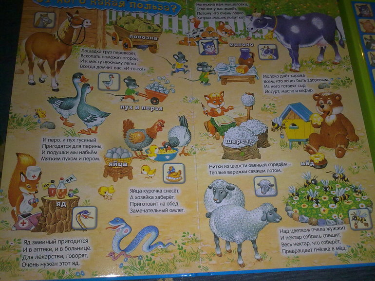 Тоже весьма хорошо внешне выглядящая книга, тяжелая, качественная. Кажется, 8 разворотов. Издательство явно завысило возраст - она тоже не для двухлеток. Как для нас, было бы самое то в 1,3-1,7 г. Ничего нового в 1,11 ребенок не увидел, но звуки его забавяют. Есть неплохие, а есть и весьма чудные, н-р, звук ежика какой-то совсем дикий. Одичал ежик)). Моему нравится звук воды.