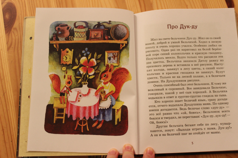 Ну, вот несколько отрывков, которые лично меня напрягают:___________После обеда Бельчиха привела сына в лечебницу. И они стали ждать, пока их позовёт доктор. Потому что раньше их пришёл лечиться Медвежонок. ___________Доктор быстро перевязал ему лапу и тут же угостил Медвежонка сладкой пилюлей. Тот сразу почувствовал себя здоровым. Сказал спасибо и пригласил доктора в гости. Как велела мама, большая Медведица. Пить липовый чай с мёдом.___________Вдруг в соседней музыкальной школе начался урок соловьиного пения. Соловей учил петь птиц по-соловьиному. Он объяснял им, как раскрывать клюв. И как держать голову. И на какой ветке лучше садиться, когда поёшь.___________И тут случилась новая беда. Приехали в лес люди. Приехали они на машине. Стали пилить сухие деревья. А как увидели сваленное дерево, обрадовались, бросили его в кузов и поехали домой.___________Он знал теперь, что ему делать. Надо забраться на самое высокое дерево и посмотреть оттуда. Не видать ли поблизости озера Синь. (здесь я вообще не понимаю, зачем сложноподчиненное предложение разбили на части)___________Все почтительно расступились. Пропустили вперёд любимого доктора. А бельчата подкатили к нему самый удобный пенёк.___________Один бельчонок-отличник написал без ошибок важную новость. А Сорока до поздней ночи носила её на хвосте. До тех пор, пока светлячки не заявили все сразу:— Мы устали зажигать наши фонарики. И хотим спать.Это только те моменты, которые меня прям до скрежета зубов напрягают)) Есть еще много терпимых)) И это только что касается вот такого дробления предложения и мыслей:)Насчет повторов: на стр.12 всего 12 строчек. И на них 7 раз употребляется "Ух Ухич". Т.е. даже чаще, чем через строчку. Я вот сходу, не напрягаясь, могу, чуть-чуть переработав текст, убрать 4 из них. Плюс меня очень раздражает диалог мамы и Дук-ду в конце, когда он по привычке хотел пойти в школу с мамой. Это хорошо выглядело бы при постановке на сцене. А когда это не пьеса, а повесть, проза... В общем, я очень глупо себя чувствую, читая этот диалог)) Все то замешательство и смущение приходится прерывать словами автора, на 2 слова вновь становиться беспристрастным автором, а через эти 2 слова вновь включать эмоции бельчонка, а потом опять автор... В общем, сложно.Реакция Куницы на брошенную в нее шишку тоже мне не нравится. Ну кто станет вопить "Ой, ужас какой! Ужас! Ужас", если ему в лоб залепили снарядом?:) Гораздо правдоподобней что-то вроде "Ай, больно!" или что-то в этом роде.