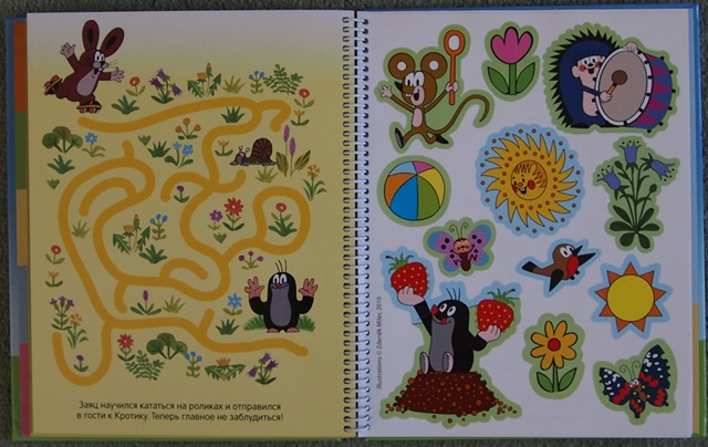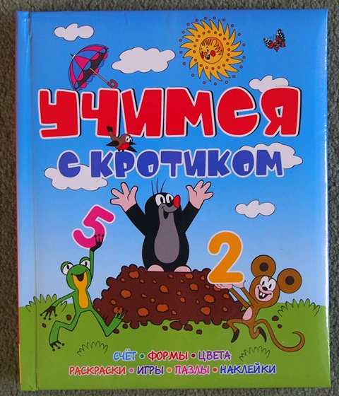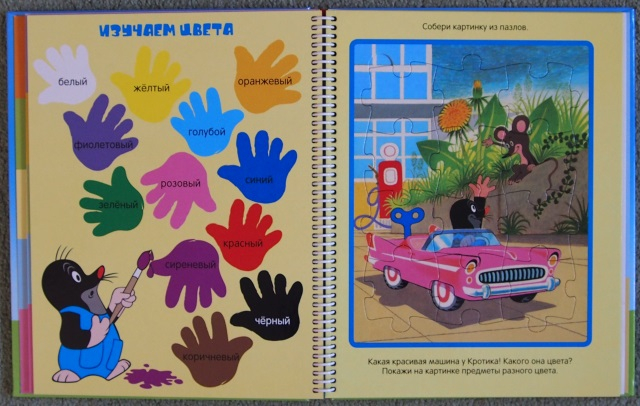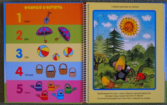 Любителям кротиков!!! Книга Учимся с кротиком. Твердая обложка, несколько твердых картонных страниц на спирали - 5 разворотов. На первом представлен счет до 5 и можно собрать картинку из пазлов, вставленных в страницу. На втором - счет до 10 и игровая страничка. На третьем развороте учим цвета и собираем пазл с заданиями. На четвертом - учим формы с игровой страничкой. На пятом - лабиринт для пальчиков и страница с наклейками.