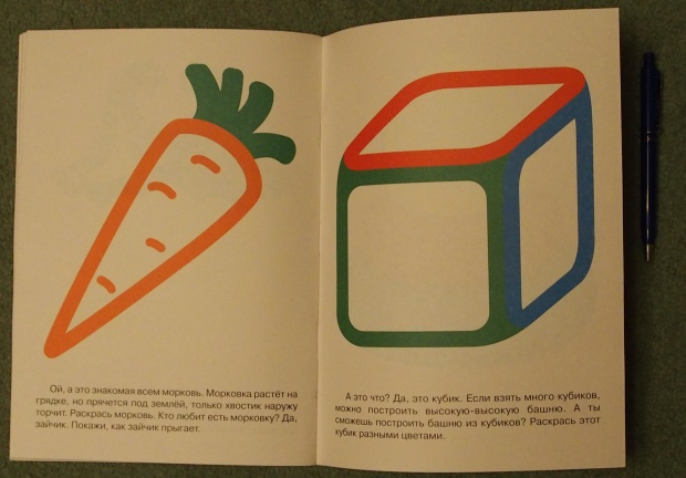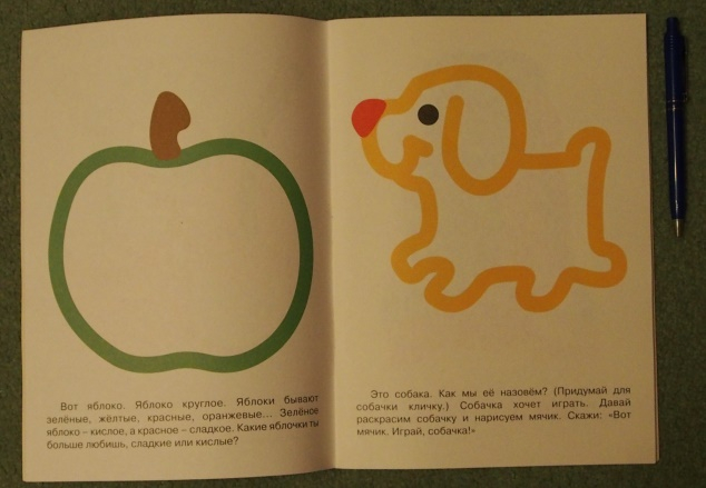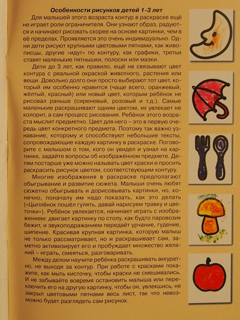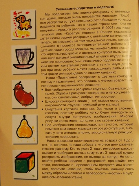 Первая правильная раскраска для малышей. Толстенькая, много страничек. Плюс в том, что для родителей, которые не очень хотят придумывать что-то сами :), есть текст с заданиями для детишек. Предметы, которые надо раскрашивать, обведены толстым контуром. Хорошая интересная первая раскраска. А почему она полезно, написано на развороте книги (см.фото ниже).