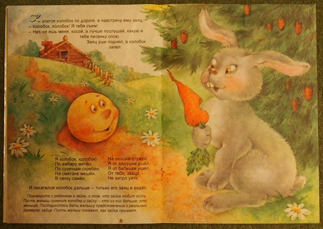 Название книжки говорит само за себя. Открывая страницы определенным образом, ребенок может видеть сравнение большой-маленький. Разворот с медведем, соответственно, самый огромный - как 8 страниц, заяц на разворот (2 страницы) и т.д. Очень наглядно, да и сказка любимая.