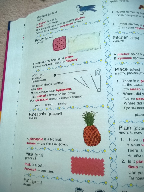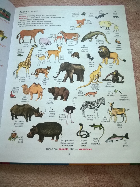 -наличие транскрипции на английском. (это огромный плюс, считаю недопустимым обучать ребенка при помощи пособий, в которых вместо нормальных транскрипций - "девочка" - {герл}, "папа" - {фаве} и т.д. Если реально учите с ребенком языки - никогда не используйте русские транскрипции! Не нужно ребенка обучать неверному произношению, потом переучивать придется...Кто не разбирается в транскрипциях - интернет Вам в помощь, есть много сайтов где можно найти верное произношение любого слова, сама иногда пользуюсь, если немного сомневаюсь в правильности произношения.