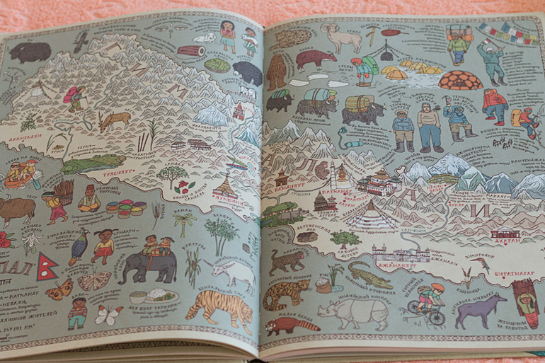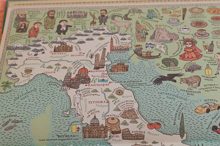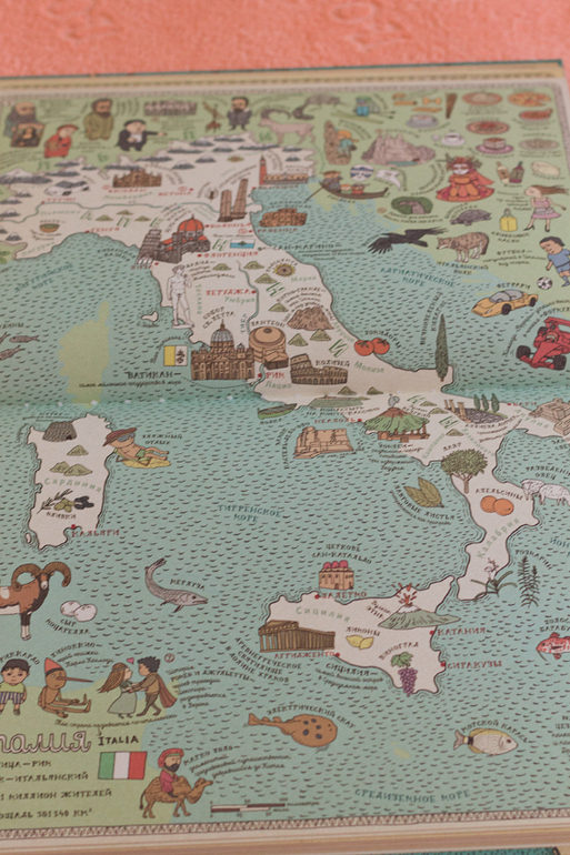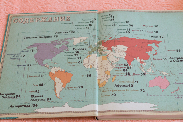 Это просто невероятная книга! Случайно увидела ее и пришла в абсолютный восторг! В книге много-много карт. Каждая страна представлена отдельным разворотом. На нем показаны основные характеристики страны: растительность, кто проживает, памятники, животные, чем/кем страна славится и т.п. Все это наглядно в картинках с небольшими подписями. Отличный способ запомнить основное о странах!