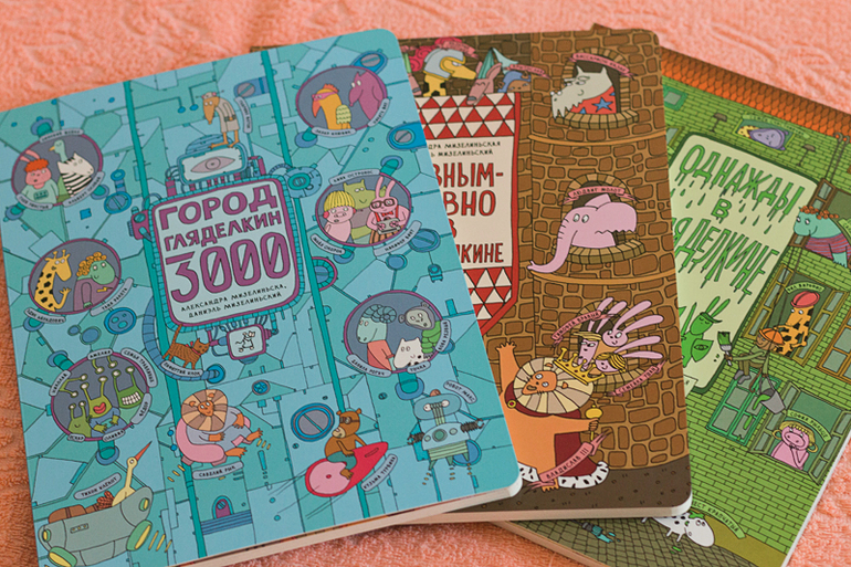 3. Серия книжек-гляделок. "Город Гляделкин 3000", "Однажды в Гляделкине", "Давным-давно в Гляделкине" Александры и Даниэля Мизелиньских.